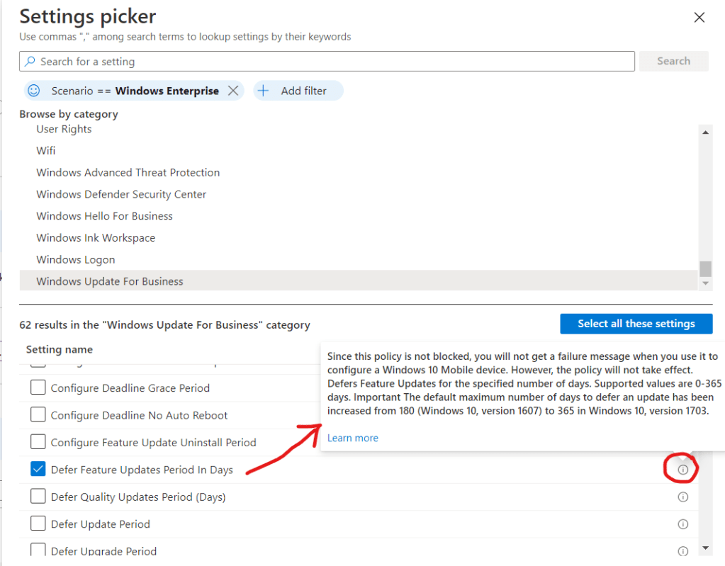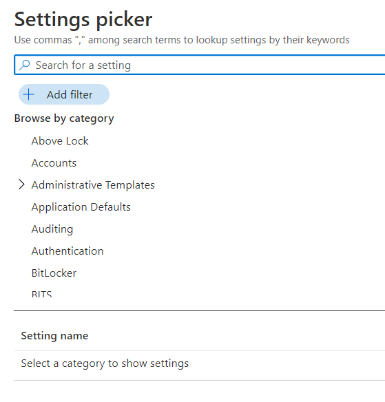 Clicking on Add setting will bring up the Settings picker panel, where you can use Search to search for the setting you want to make, or browse through the category.