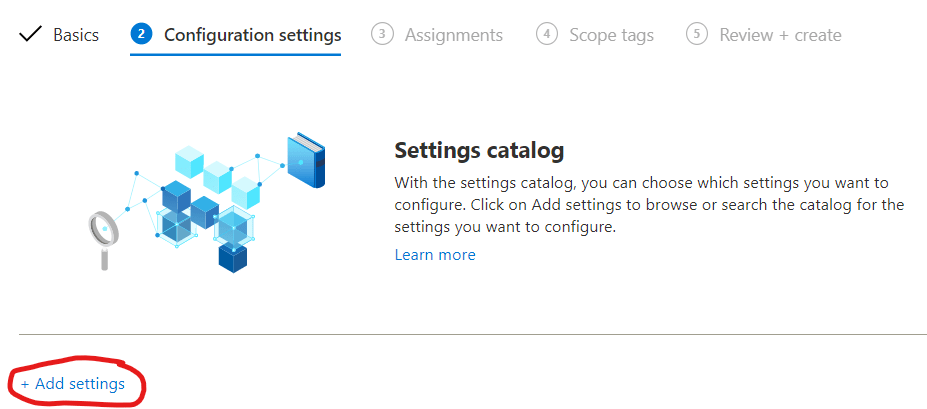 On the Configuration Settings tab of the Create device configuration profile you will see the new Settings Catalog functionality, you can click on Add settings to configure the settings.